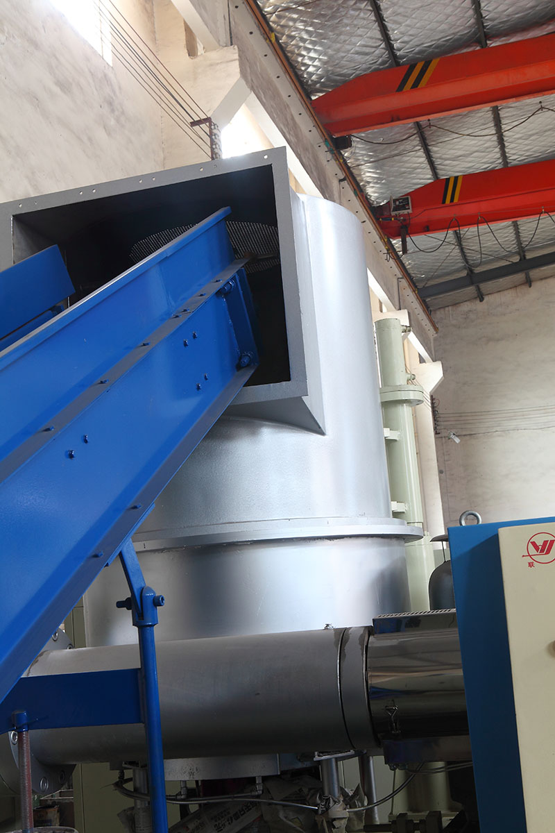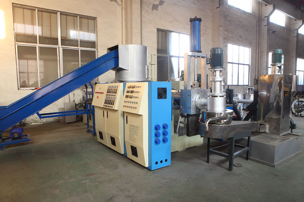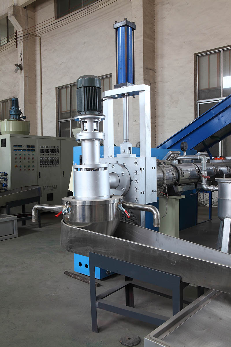 輸送帶、壓實(shí)倉(cāng)、單螺桿擠出機(jī)、液壓模頭換網(wǎng)裝置、冷卻水槽、切粒機(jī)、風(fēng)送料倉(cāng)、控制電箱等組成。