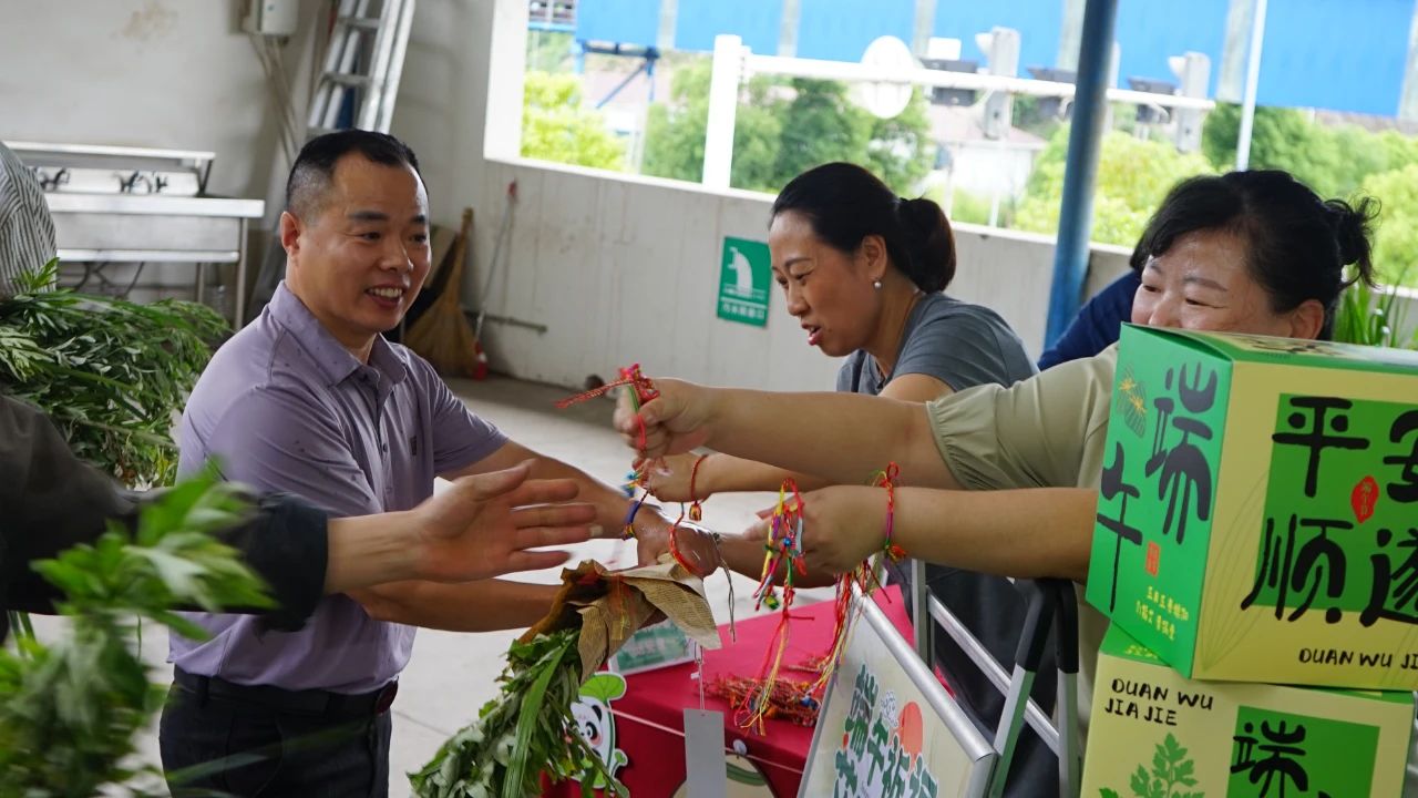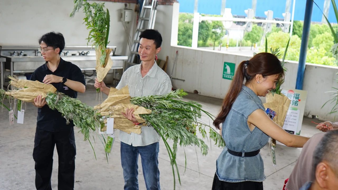 青青艾草,福瑞盈門。員工們親手扎制艾草花束,艾葉的辛香與菖蒲的挺拔相映成趣。這親手制作的“百福草束”,是傳統(tǒng)“招百福”吉物的演繹。長桌鋪陳,青翠的艾葉與淡雅的菖蒲整齊排列,綠意盎然。三銘領(lǐng)導(dǎo)與員工分發(fā)艾草花束,將祝福與期許細(xì)細(xì)纏繞。