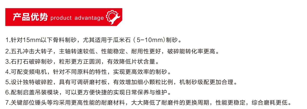 三銘重工UL系列立軸式超細(xì)碎制砂機(jī),是我公司結(jié)合國內(nèi)外先進(jìn)的破碎制砂理念,依托多年國內(nèi)破碎制砂經(jīng)驗,研發(fā)的一款以15mm以下小碎石為原料的超高性能制砂破碎設(shè)備。其繼承了傳統(tǒng)沖擊破穩(wěn)定、磨耗小的優(yōu)點,而且成品砂粒形方正圓潤,級配合理,完全滿足國內(nèi)對高品質(zhì)機(jī)制砂的質(zhì)量要求。尤其適用于高品質(zhì)機(jī)制砂的生產(chǎn),粒形更方正、片狀更低、級配更合理,可滿足國內(nèi)對高品質(zhì)機(jī)制砂的質(zhì)量要求。