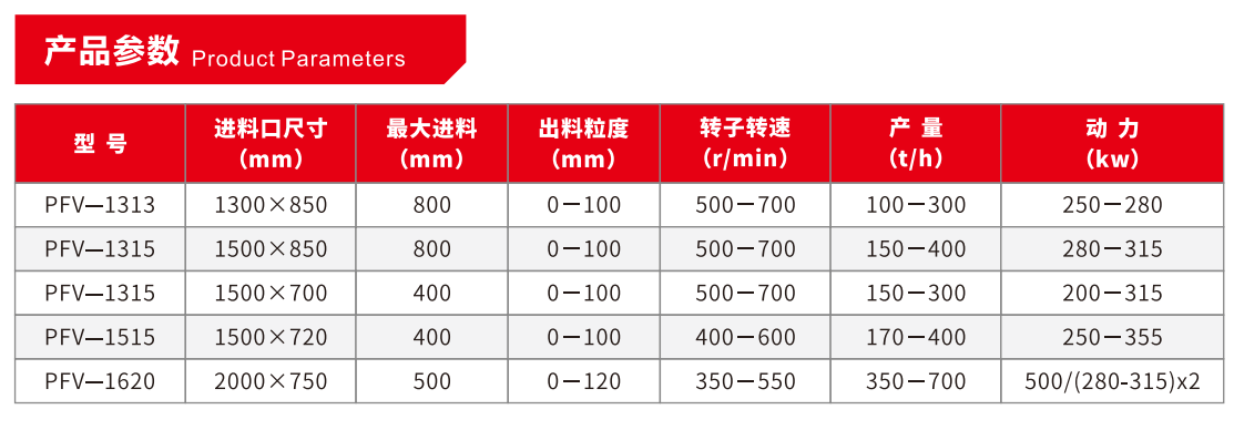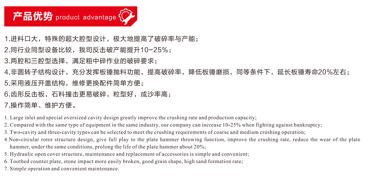 本系列產(chǎn)品是我公司總結(jié)吸收國內(nèi)外先進(jìn)技術(shù)的基礎(chǔ)上,經(jīng)優(yōu)化設(shè)計(jì)而研制出的一款新型三腔反擊式破碎機(jī)。廣泛應(yīng)用于高速公路建設(shè)、水利工程、建筑碎石、機(jī)制砂加工等領(lǐng)域。適用于抗壓強(qiáng)度不超過200Mpa各類物料的破碎,如青石、石英石、石灰石等。